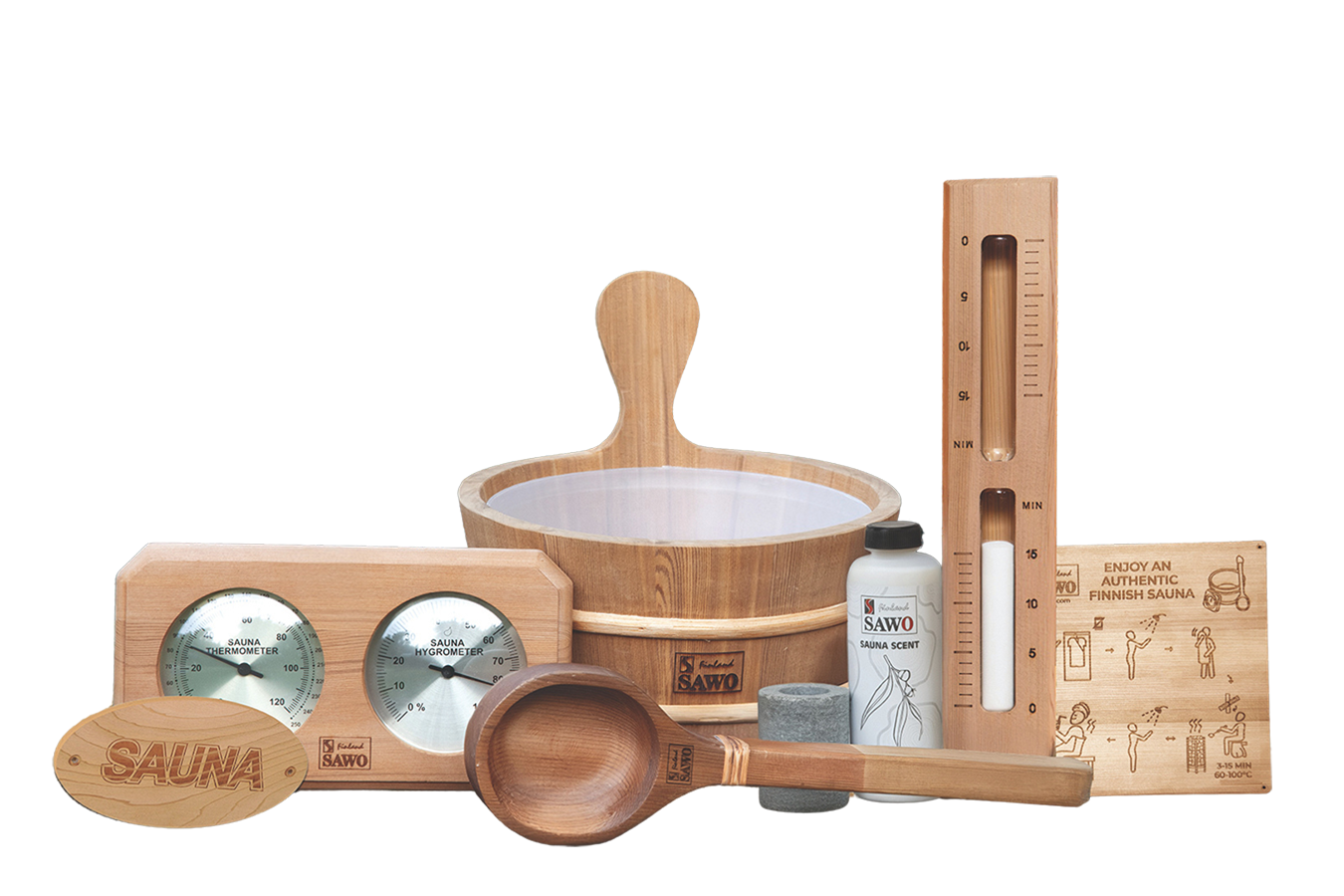 SET INCLUDES: Wooden Pail 4L Western Red Cedar, Wooden Ladle Western Red Cedar (36cm), Wooden Thermohygrometer Western Red Cedar, Wooden Sandtimer Western Red Cedar, Aroma Cup, Aroma Oil Eucalyptus Scent (250ml), Sauna Signage Cedar, and Sauna Guidelines Cedar.