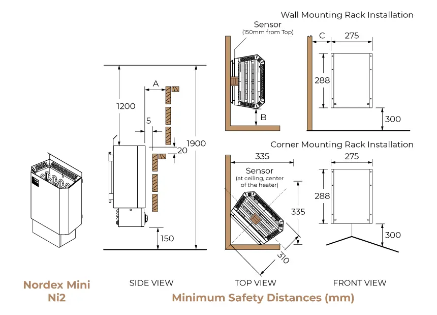 The ultra-compact Nordex Mini can be wall-mounted into a straight or corner position. It is available with stainless steel or black metal casing, and compatible with separate Saunova (Ni2, NS) and Innova (NS) controls.