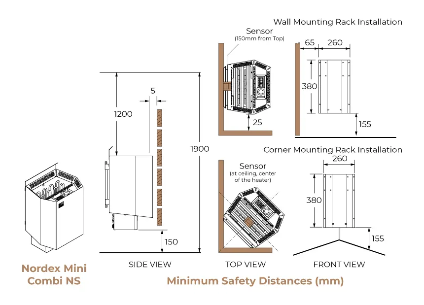 The ultra-compact Nordex Mini Combi adds humidity to the heat with its water tank. It is available with stainless steel or black metal casing, and compatible with separate Saunova (NS) and Innova (NS) controls.